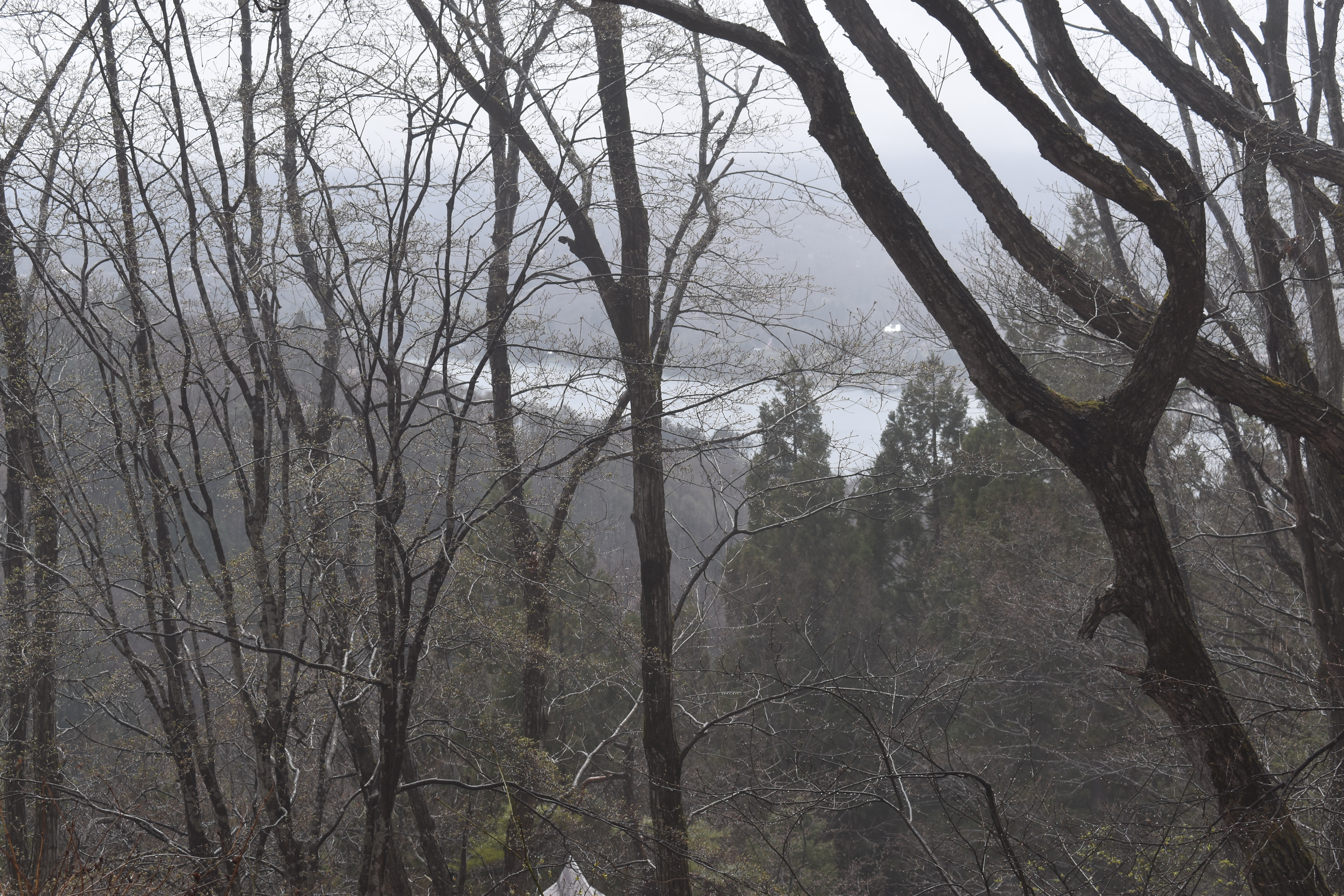 手前の道路から野尻湖が見えます(葉が落ちている時期)