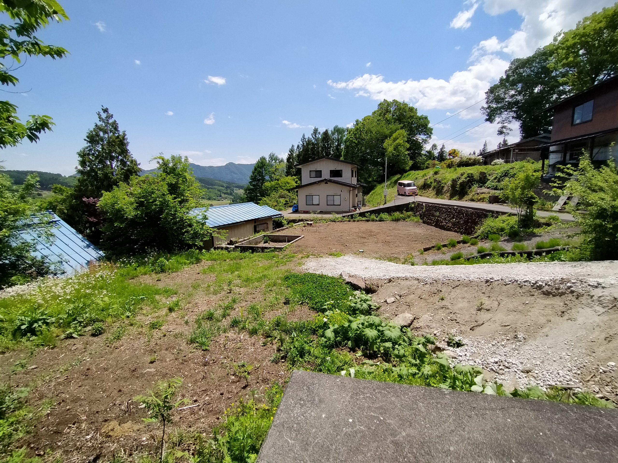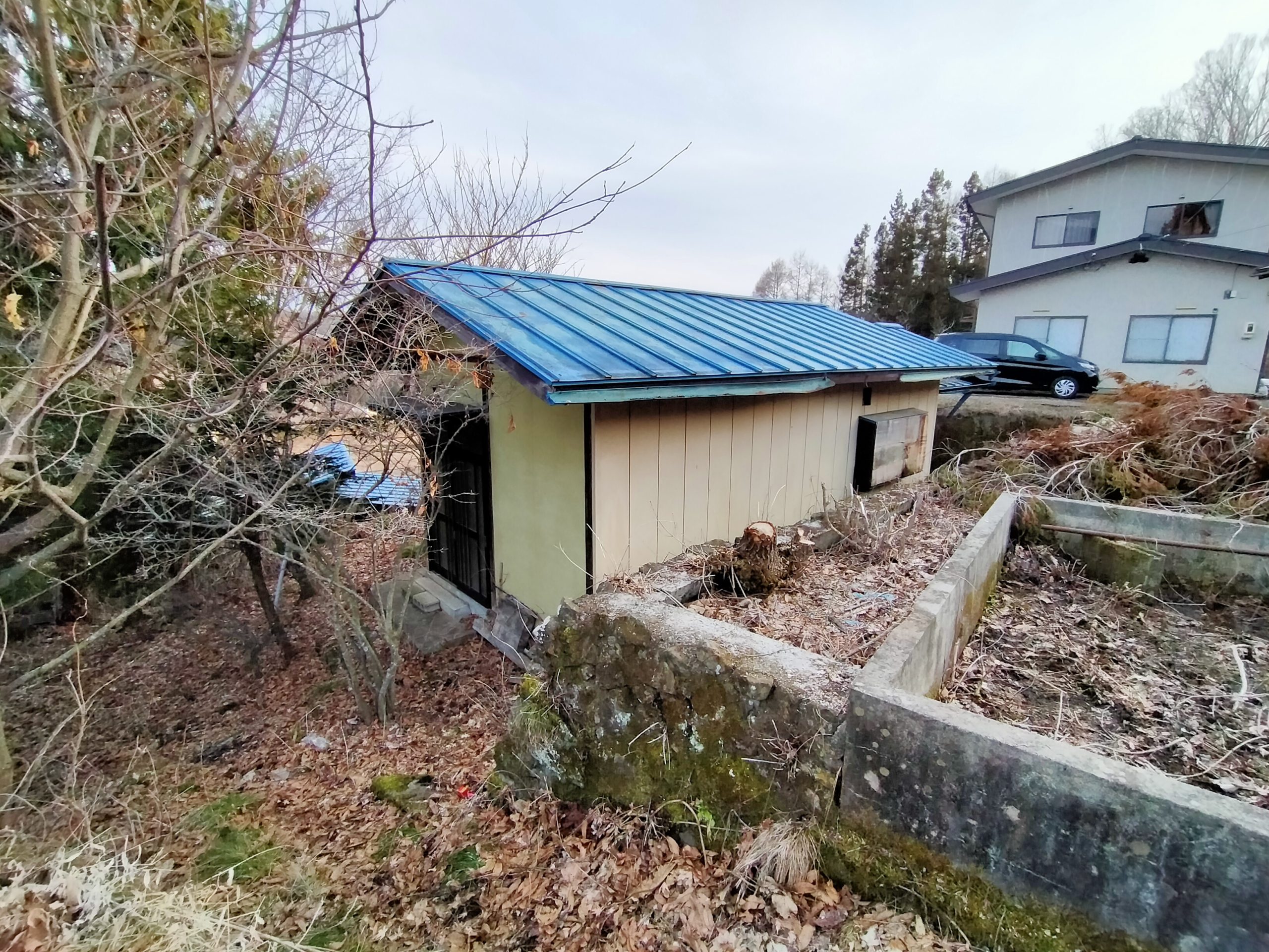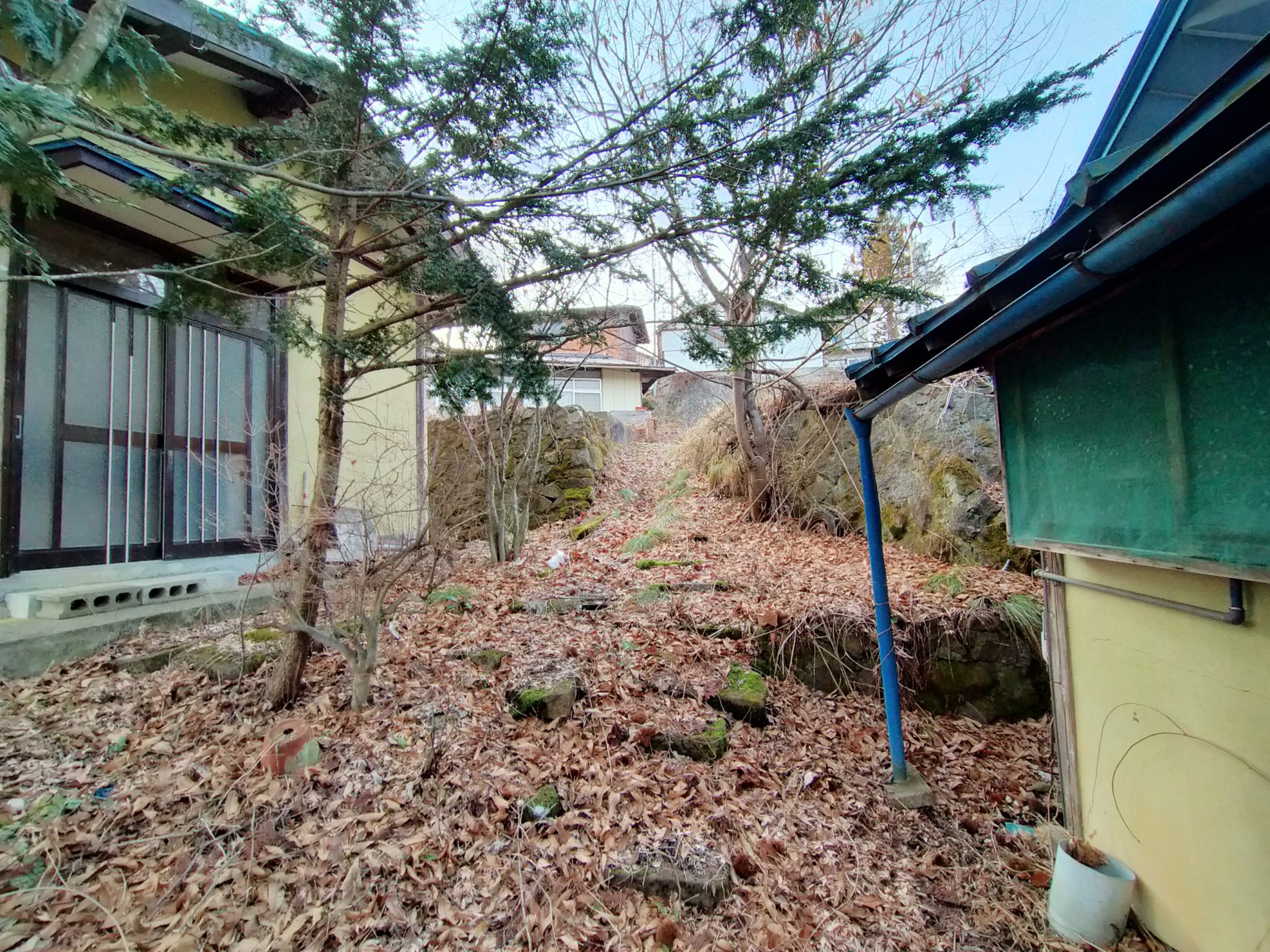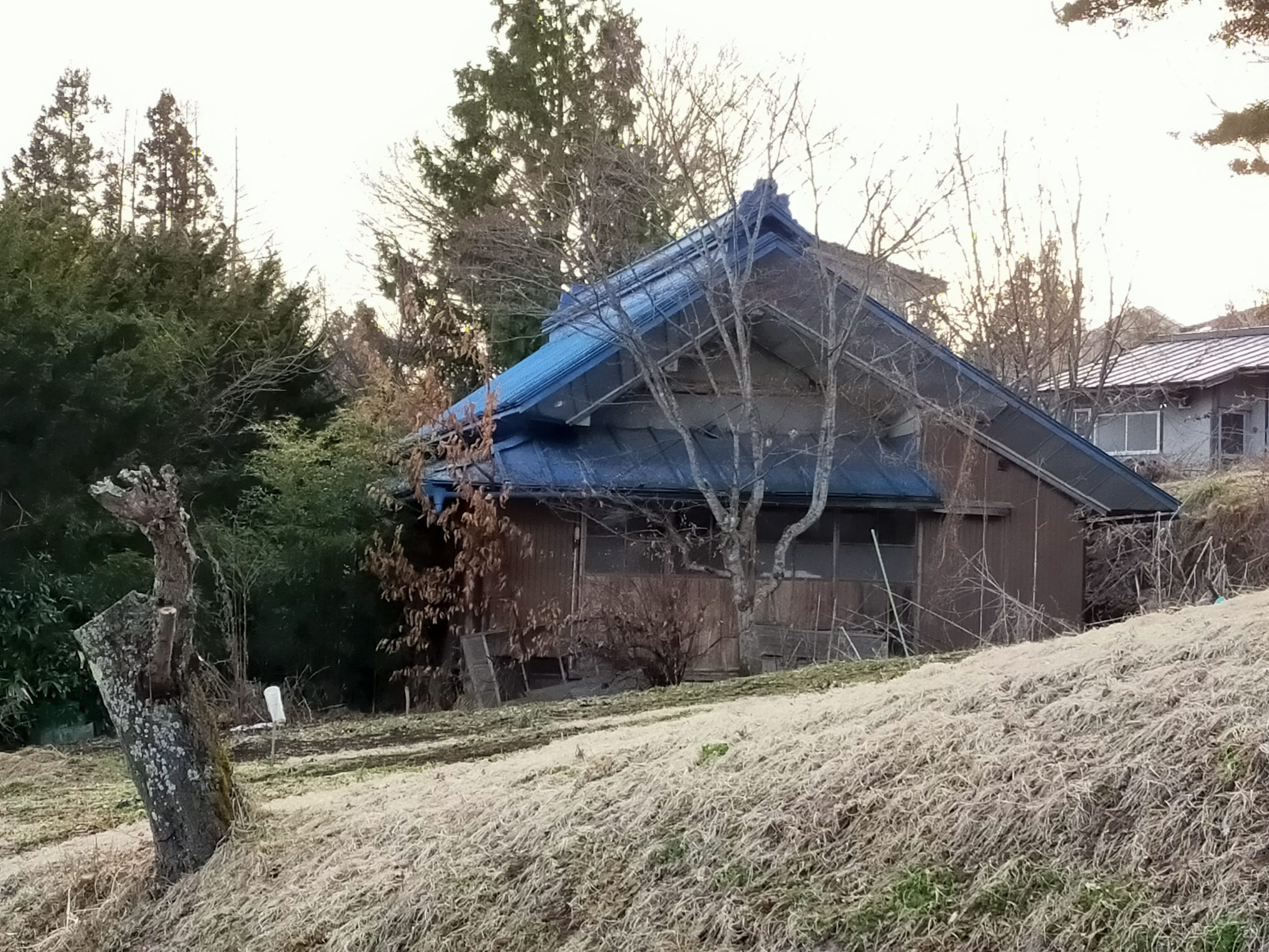 雪景色の写真は2021年2月10日のものです。2棟の住宅が見えます。この住宅は古民家風母屋と近年の離れが建っております。整備は必要ですが、母屋は昭和を満喫できます。2棟と下までの敷地も付いています。如何でしょうか。戸隠の中でも宅場が近いなど便利な所です、ぜひ、ご検討ください。